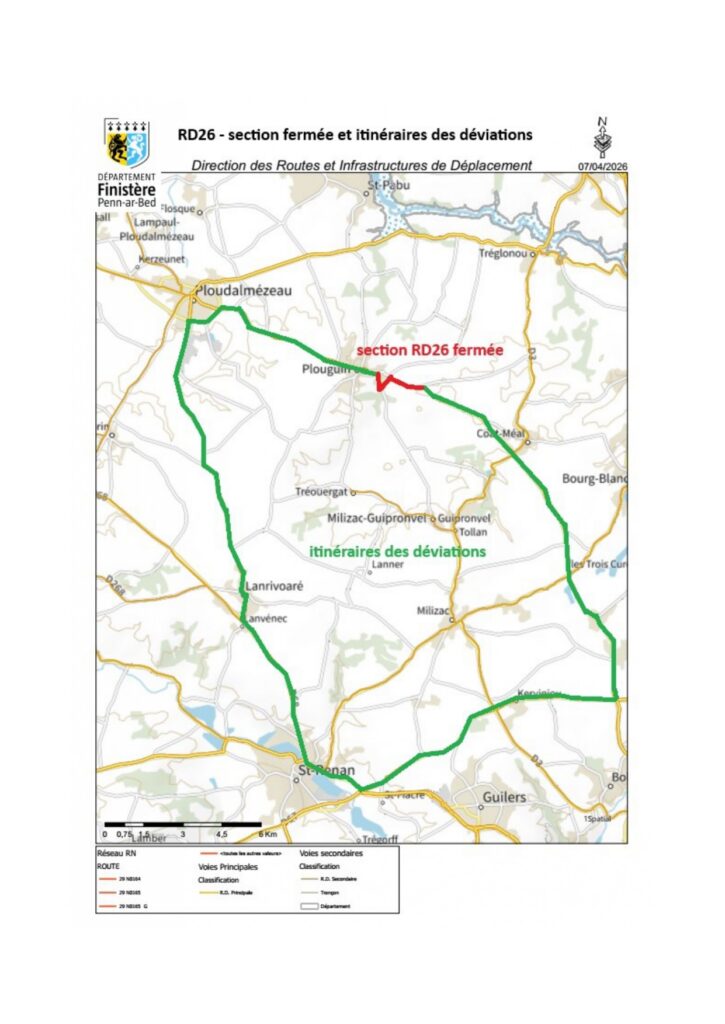 Travaux du 11 au 13 mai 2026 inclus – RD26 –  section située sur commune de Plouguin.