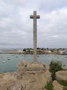 - L’ÈRE CHRÉTIENNE est symbolisée par la magnifique croix monolithique qui domine le site. Celle-ci provient du cimetière qui se trouvait en contrebas, à SAINT USVEN, à proximité d’une chapelle utilisée jusqu’au début du 18è siècle. La croix, dernier vestige de cet ensemble paroissial, a été déplacée au sommet du promontoire en 1895.