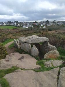 En effet, ces fouilles ont amené la découverte, dans une tranchée de sondage, d’un «atelier» de taille de microlithes (petites armatures en silex) datant du mésolithique, soit environ 8.000 ans. La deuxième découverte concerne le Néolithique : le monument qui était toujours qualifié «d’allée couverte» s’est révélé, après fouille et redressement des pierres, être un dolmen à entrée latérale, ce qui est moins courant en Bretagne. De plus, encore et par chance, on a découvert, enfouie à proximité, la pierre ovale qui servait à fermer la chatière, c’est-à-dire l’orifice par lequel on introduisait les corps des défunts à l’intérieur.